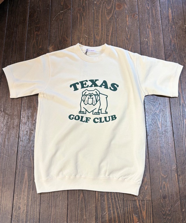 & CLOSET.のオリジナルスウェット半袖 No.4 【架空のゴルフクラブ】 テキサス ゴルフクラブ 半袖スウェット ブルドッグをゴルフクラブのアイコンとして、どこか憎めない表情のブルドッグをデザイン。 ゴルフ好きはもちろん、犬好きにもたまらない一枚に。 8.2オンスなので薄手で柔らかな肌触り。 裏地はパイル素材。 メンズには珍しい、ナチュラルとミントのカラーバリエーション。 コットン100% サイズM 肩幅 48cm 身幅 54cm 着丈 69cm 袖丈 25cm サイズL 肩幅 51cm 身幅 59cm 着丈 70cm 袖丈 25cm