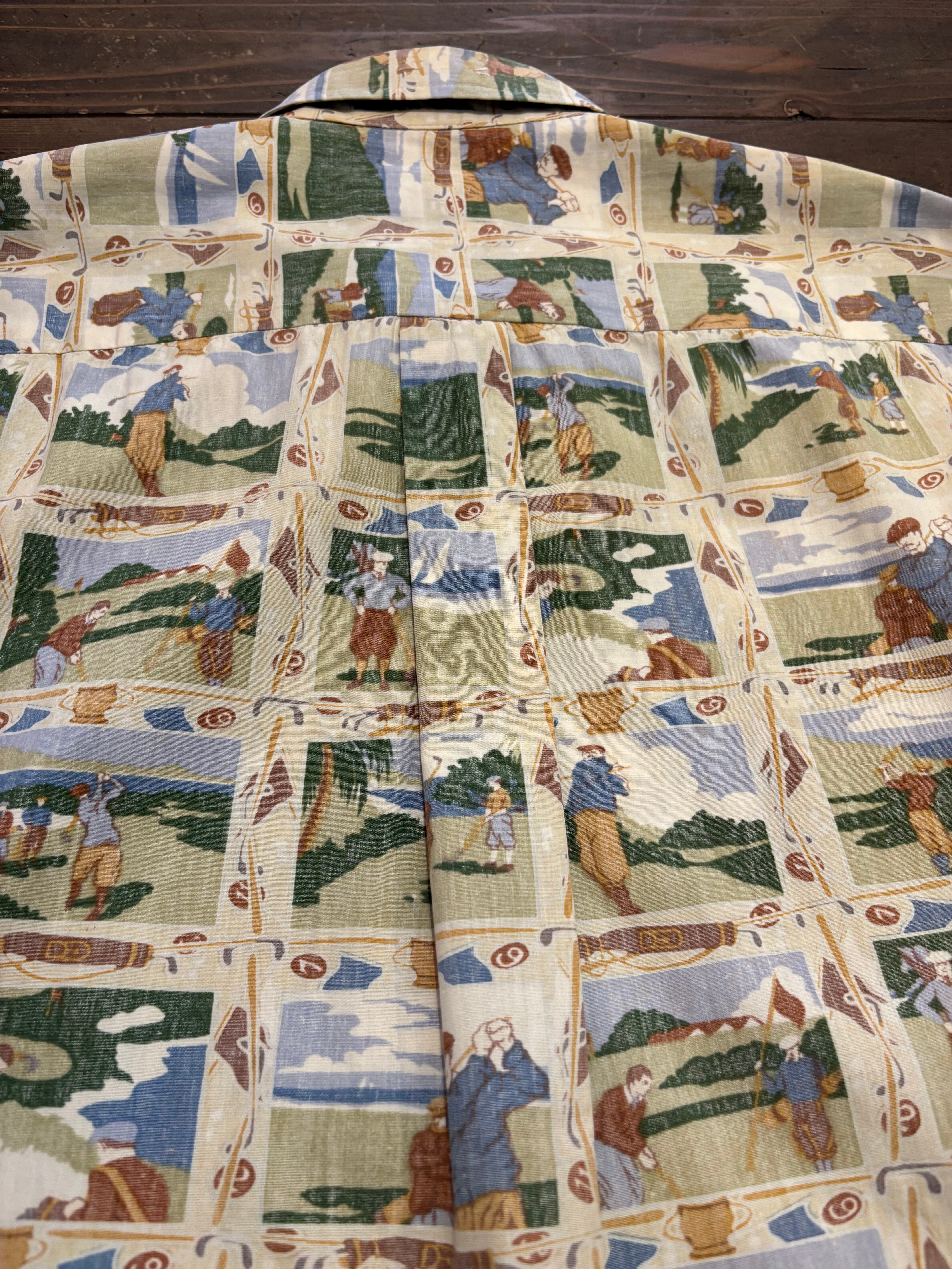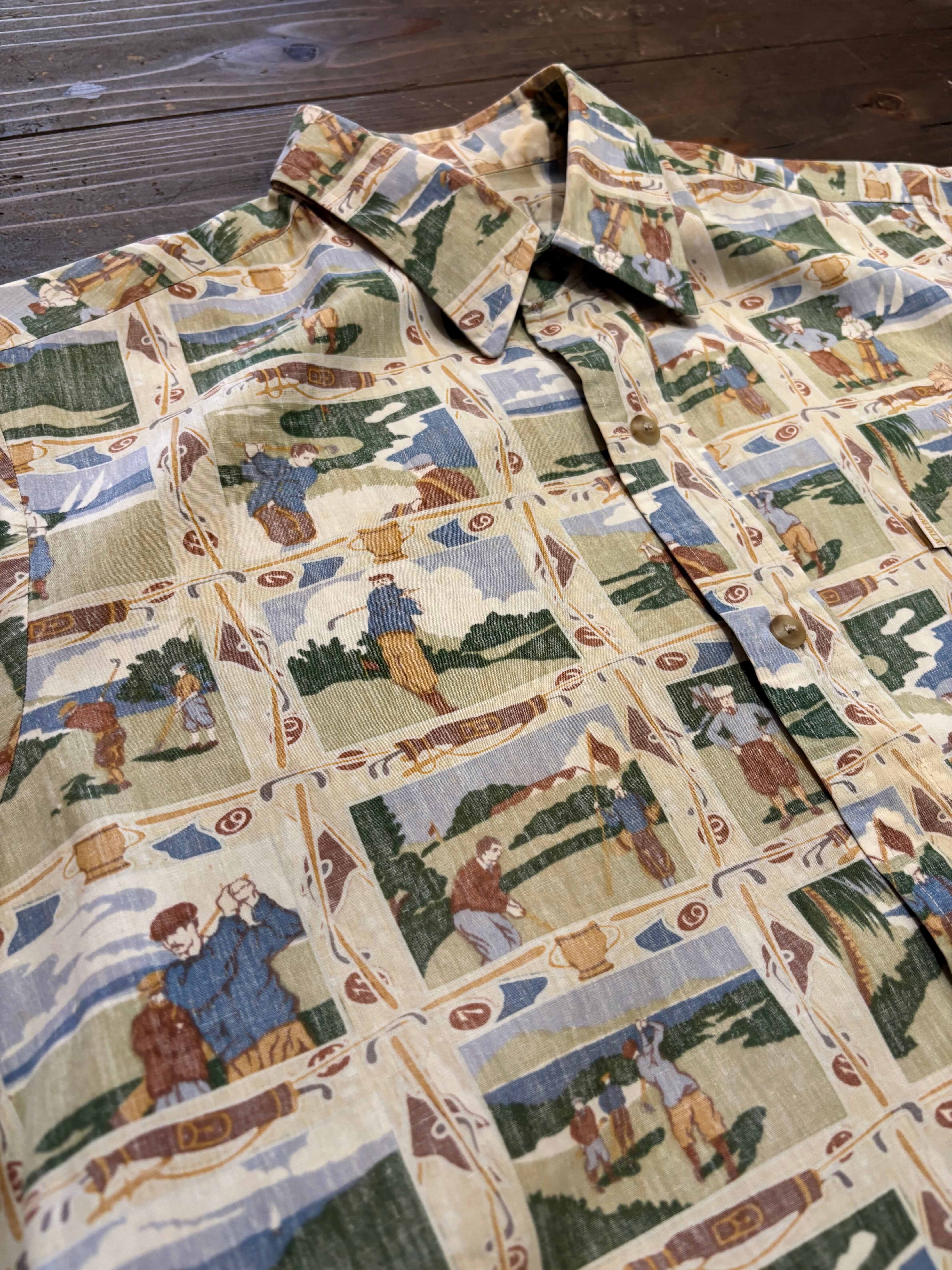 こちらのシャツはユーモアのあるgolfモチーフのデザインで生地の裏面をあえて表側に使用した特徴的なデザインです。