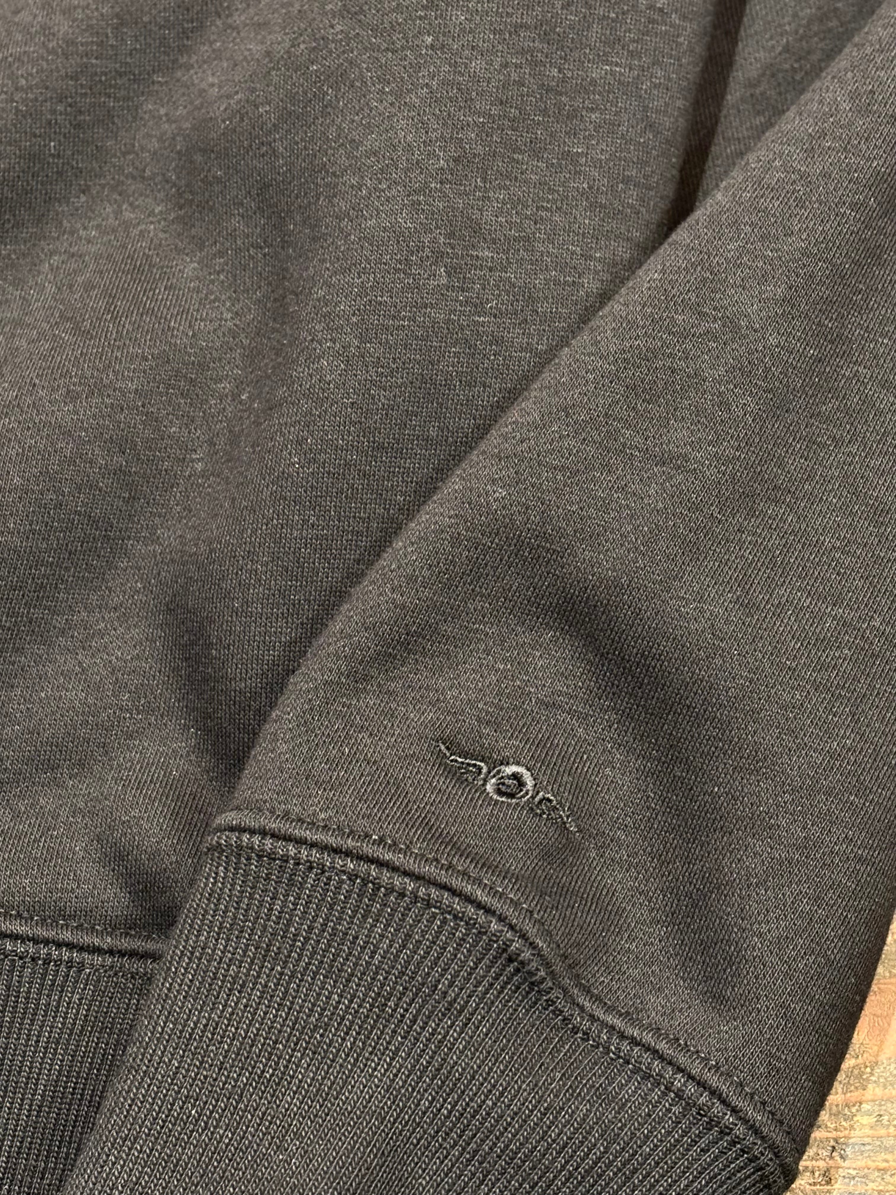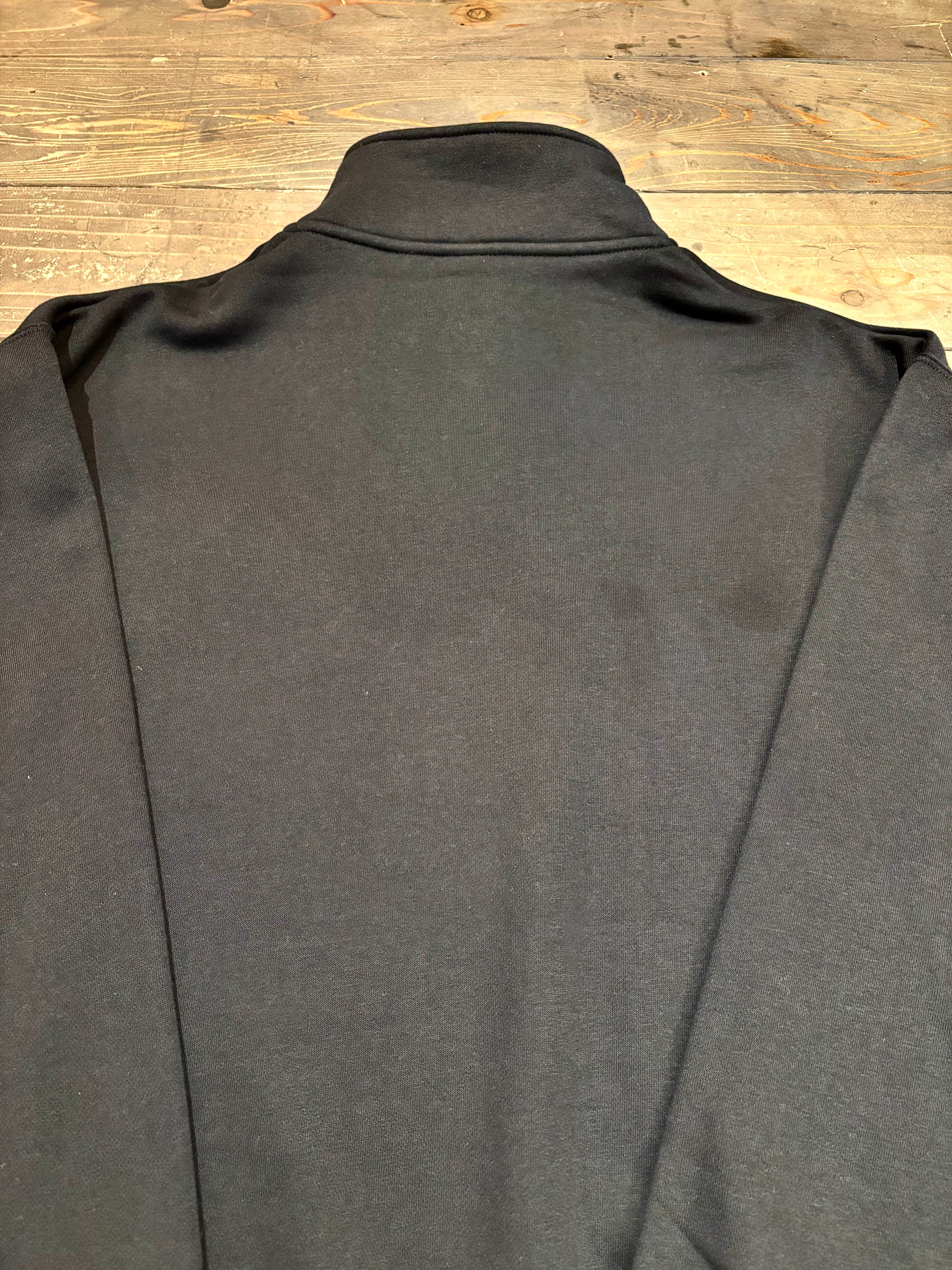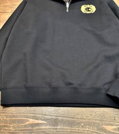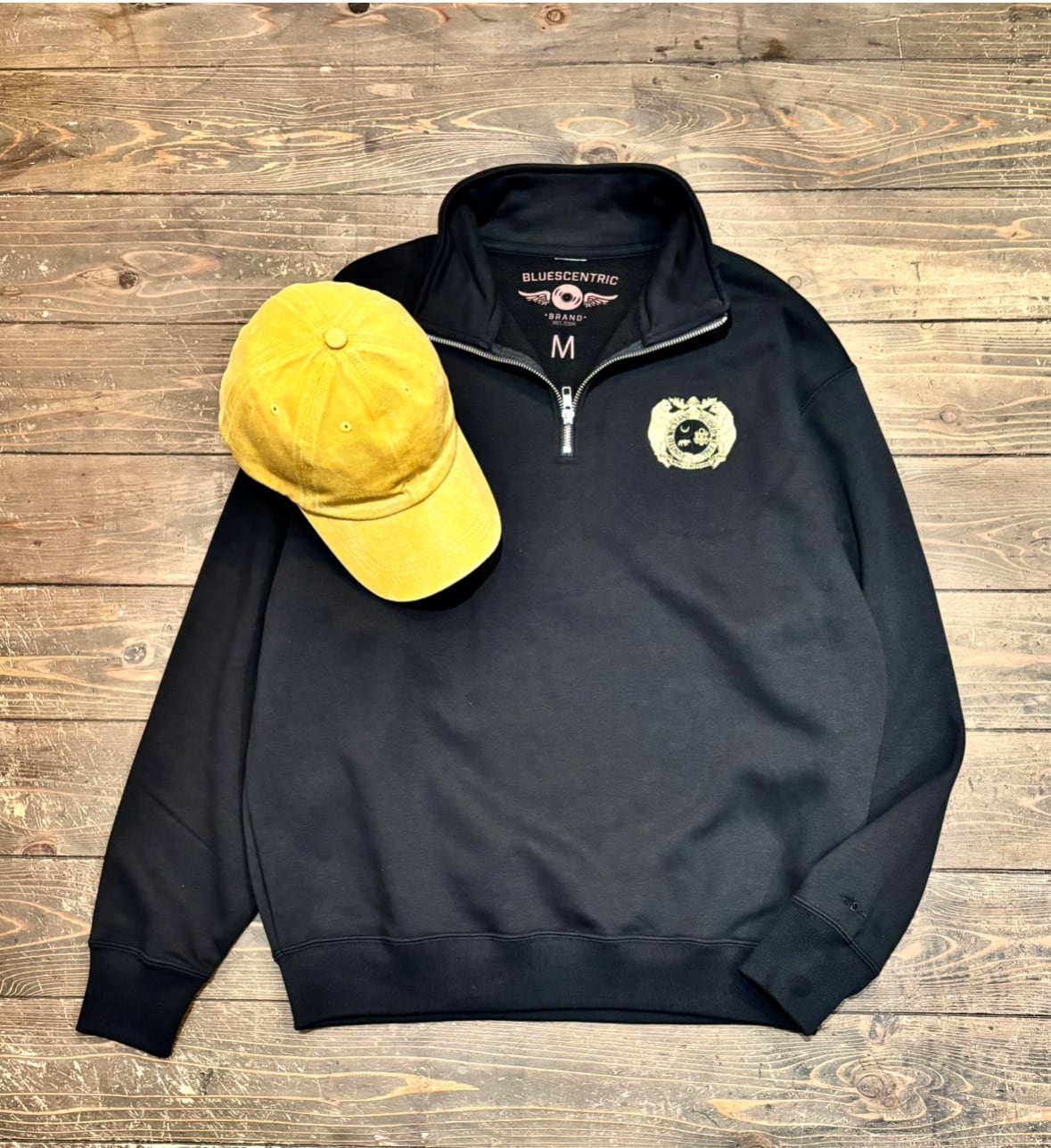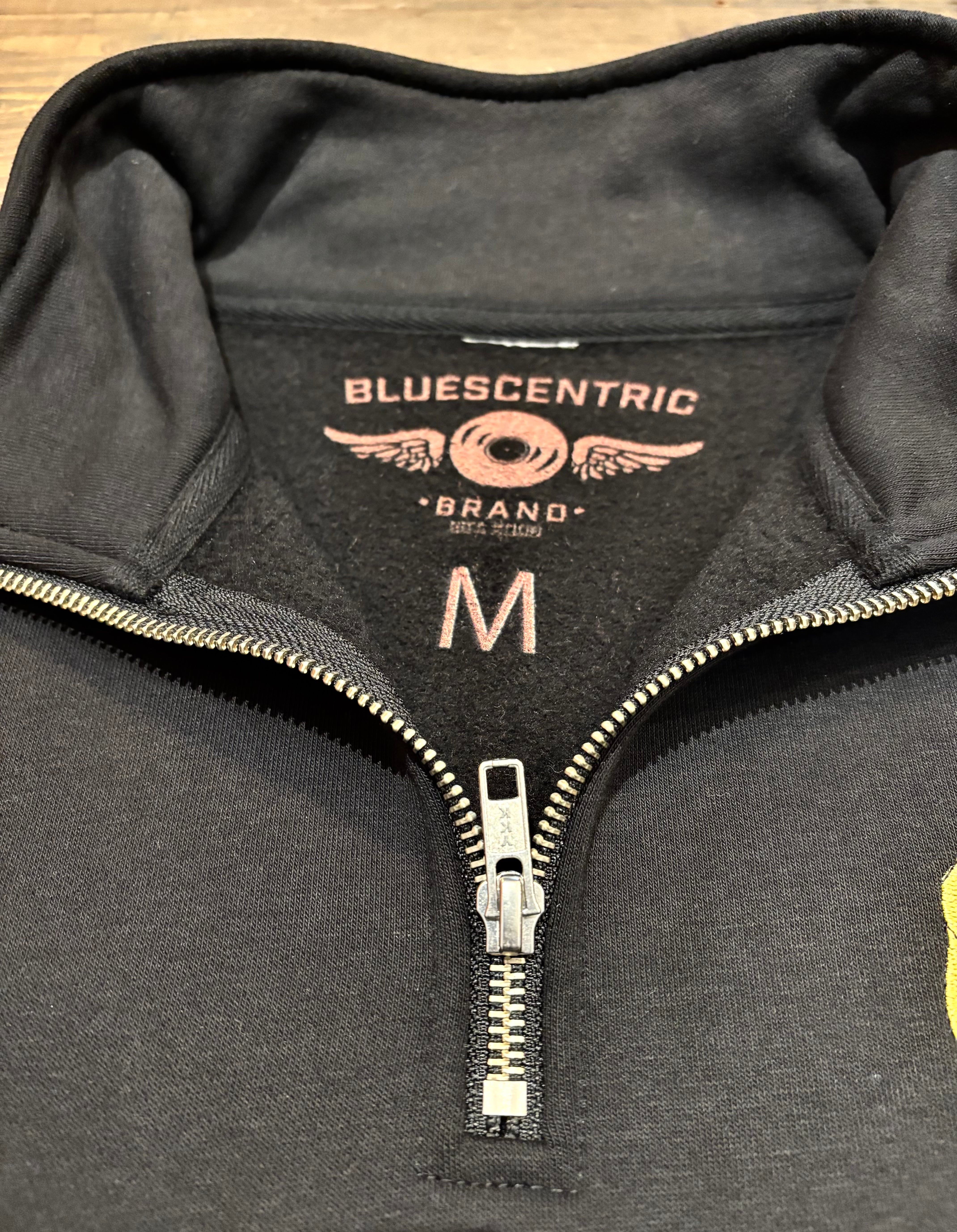 アメリカの音楽カルチャーを背景にした BLUESCENTRIC ハーフジップスウェット。胸元にはレコードをモチーフにしたブランドロゴがワンポイントで入り、シンプルながら存在感のあるデザイン。